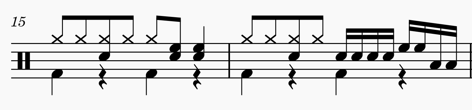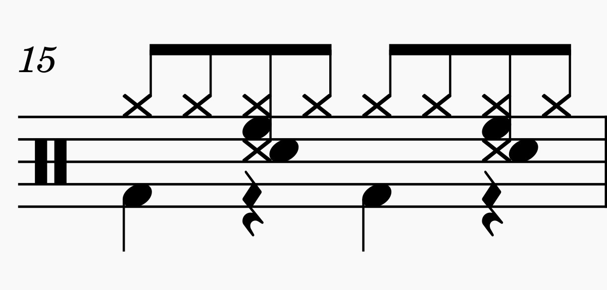While the bass drum line is still playable, the rest of the notation is a mess. When a snare drum and hi-hat are hit at the same time, it typically requires both hands. However, in this example, we see the snare drum, hi-hat, a high tom, and a cross stick on the snare all being hit simultaneously. Unless someone has four arms, this notation is essentially impossible to play.