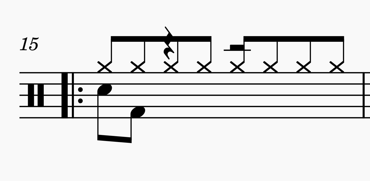 Last week’s progress in creating these measures has shown that splitting the grid with the bass drum can be achieved quite cleanly. I’ve realized that what’s most likely allowing this to happen is the fact that the stem directions are separate from the top, which is not the case with the snare drum and hi-hat. Throughout the past few weeks of learning about writing these measures, I’ve found it frustrating that the snare drum and hi-hat always seem to be together. Now, this issue is becoming even more pressing since it’s directly interfering with writing more passages like these ones. The goal is to get the snare drum to go off the grid just like the bass drum, and I’m currently working on figuring out how to do that.