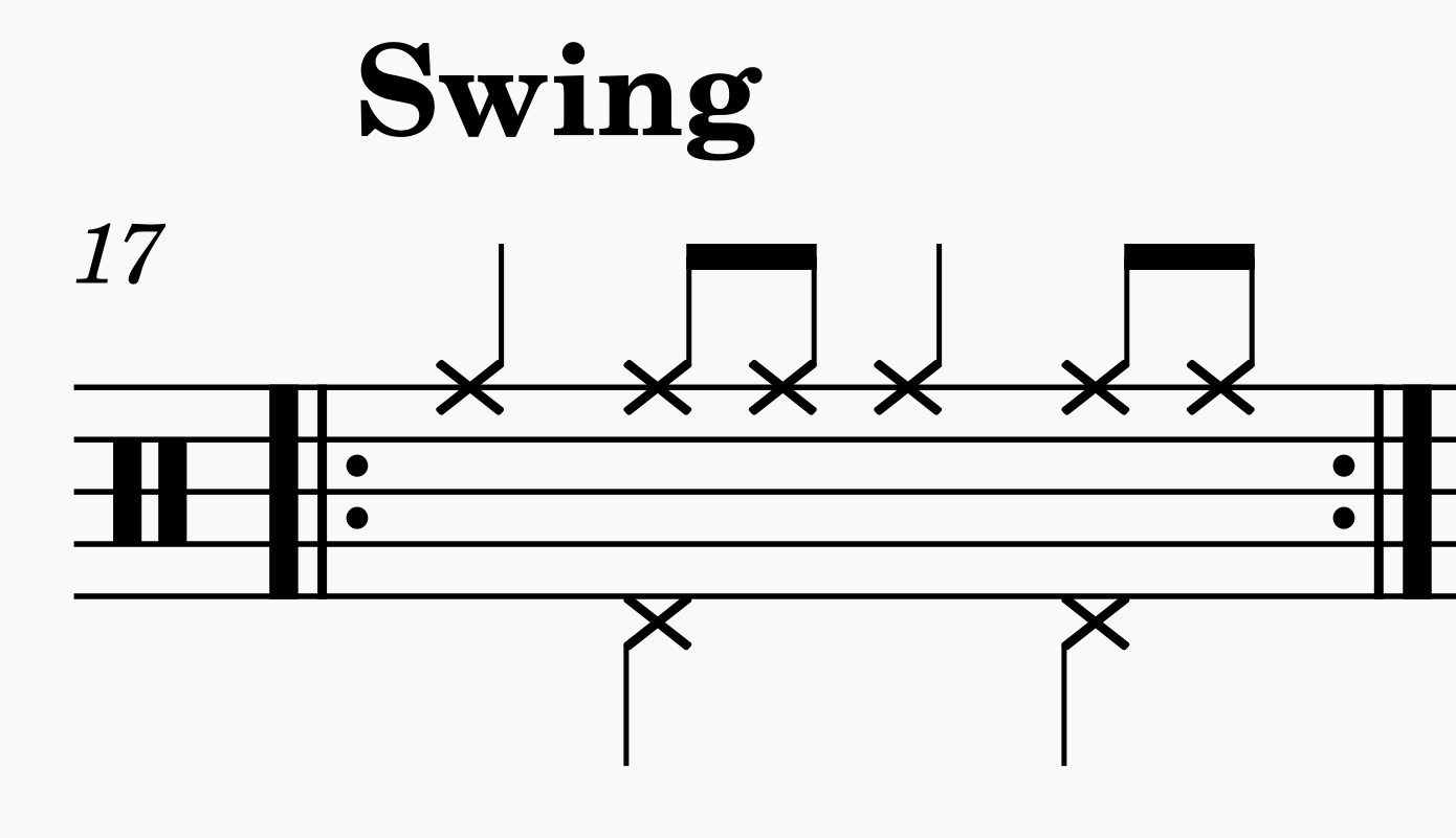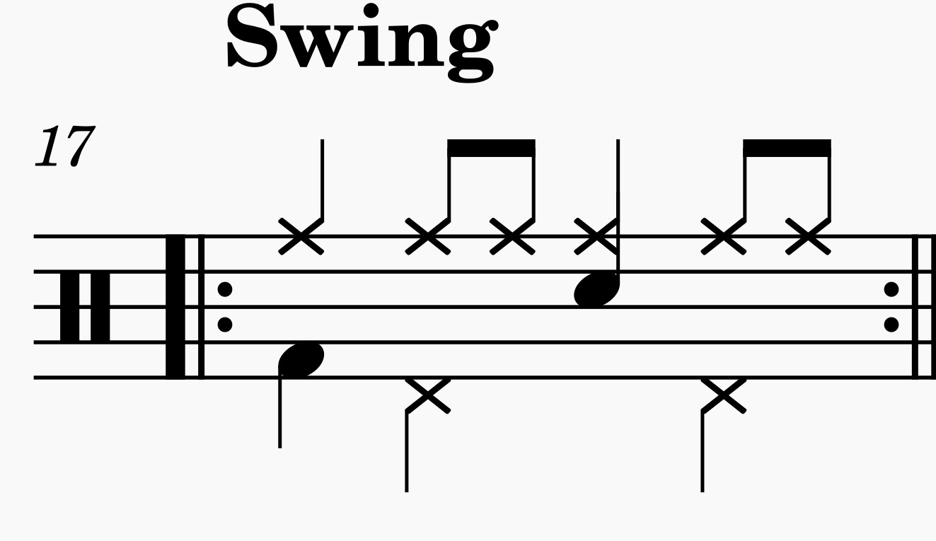 Welcome to week 7 of our 8 week project! Last week, we really pushed the limits of syncopation and figured out how to influence the snare voice more effectively to create more interesting grooves. It was definitely a lot of grunt work and learning how to use the notation software in this way, but it allowed us to create some really cool drum beats. This week, we’ll be focusing on bigger picture works and showcasing some of the more complex drum beats that we’ve been working on. Additionally, we’ll quickly touch on how swing is written for drum set, as it’s a fundamental concept in jazz and other styles of music.